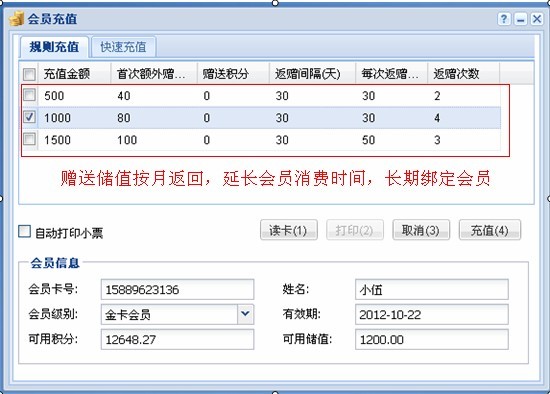 一卡易会员管理系统提供了功能强大的会员储值卡功能,不仅能实现简单的充送规格,还能实现赠送部分按月返还的形式(如中国移动的赠送话费按月返还功能),这样既能让利于会员,又能锁定顾客回头消费,一举两得。